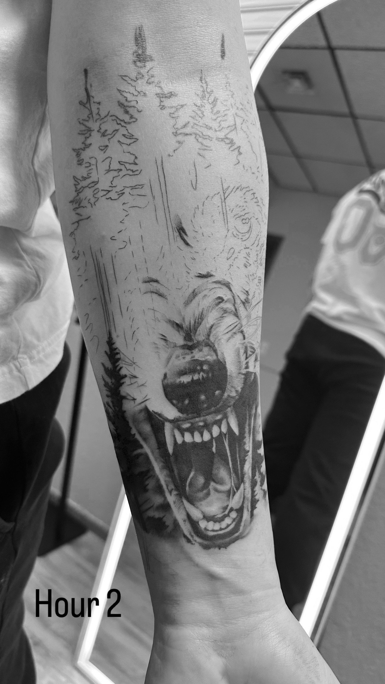 Our realistic tattoo service is built for clients who want artwork that feels alive on the skin. We specialize in black and grey realism with sharp detail, smooth gradients, and bold contrast. The wolf piece shown here is an example of the depth and texture we aim for in every design. Each strand of fur, each shadow in the forest background, and every highlight around the teeth is placed with intention to create a tattoo that pulls you in.